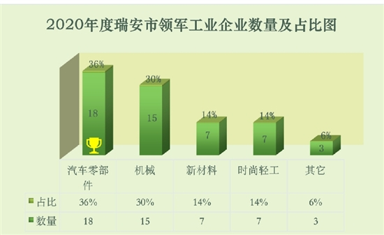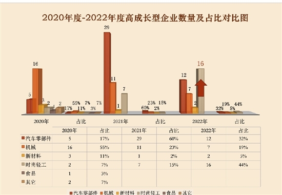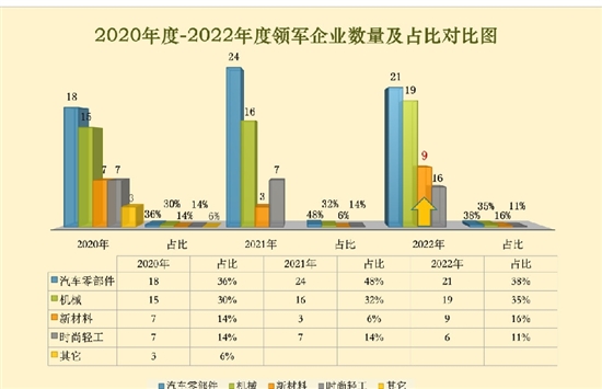 55家领军企业中,汽车零部件产业企业入围数量最多,共21家、占比38%;机械产业企业19家、占比35%;新材料产业企业9家、占比16%;时尚轻工产业6家、占比11%。 37家高成长型企业中,时尚轻工产业企业数量最多,共16家、占比44%;汽车零部件产业企业共12家、占比32%;机械企业7家、占比19%;新材料产业企业2家、占比5%。