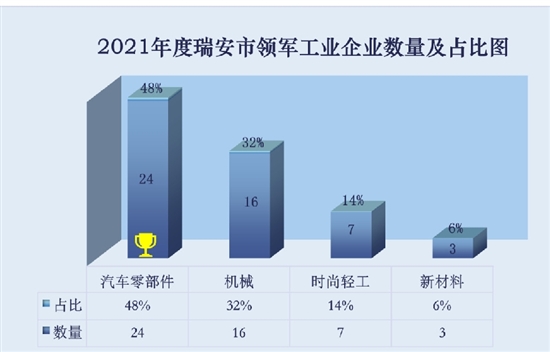 部门说:工业是地方经济发展的“定海神针”,是衡量地方综合实力的重要标志。这33家企业,就是瑞安工业发展的“定海神针”。疫情三年,全球制造业企业都面临着生产端“断供”和需求端“萎缩”的双重挤压,如何逆势突围成为每家企业面临的现实难题。这些领军企业,它们把握危中之机,积极加大技术研发力度、投身智能化改造提升抗风险能力,适时扩大优势产能储备,企业竞争力和效益得到进一步提升,部分还摘得制造业单项冠军企业(产品)、国家级专精特新“小巨人”企业、隐形冠军企业等头衔,成为细分领域当之无愧的“扛把子”;它们逆势前行,把握每一个产业复苏的机遇,带动上下游企业“齐步走”,助力瑞安经济高质量发展,瑞企“优秀生”的名号实至名归。