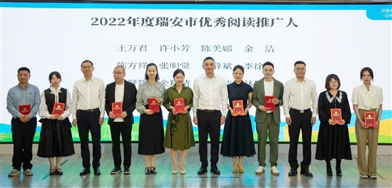 现场还举行了颁奖仪式,先后为瑞安市2023“阅读点亮生活”摄影大赛获奖者颁奖,为2022年度瑞安市优秀阅读推广人颁发证书及赠书,为2022年“这十年,我的电影生活”温州市主题电影微影评短视频征集大赛瑞安获奖作者颁发荣誉证书,为2022年度“书香瑞安”全民阅读先进单位授牌,为2022年度获得温州版权示范单位(园区)的瑞安企业颁发奖牌。