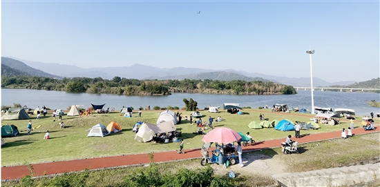 5月1日,高楼镇人民政府办公楼前的寨寮溪畔草坪吸引了很多市民前来露营,周边的停车场里停满了私家车。远远望去,草坪上聚集着密密麻麻、五颜六色的帐篷,他们在帐篷里休憩聊天、观赏美景、放松心情。“现在乡村旅游不再一成不变,每月都有新花样,不仅能体验干农活、制作应季美食,而且还有很多游玩的项目,吸引了不少回头客。”高楼镇相关负责人说,今年“五一”假期,高楼境内的主要景点游客量都爆满。