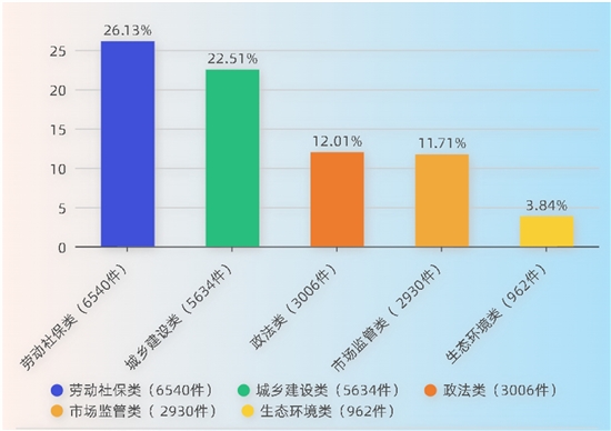 4月,市12345政务服务热线共受理群众来电25027件,其中反映较多的前5类分别为:劳动社保类 6540件,占比26.13%;城乡建设类5634件,占比22.51%;政法类3006件,占比12.01%;市场监管类 2930件,占比11.71%;生态环境类962件,占比3.84%。所有来电直接答复18935件,群众满意率98.05%;交办部门6092件,按期办理率100.00%,规范办理率100.00%,诉求化解率96.6%,群众满意率97.54%。
