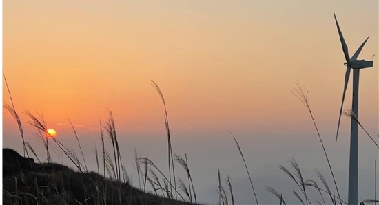 此时的太阳还十分热情地普照着群山,我的后背已经微微渗出了汗,我能感觉到太阳就在我们身边,可抬头却怎么也找不到太阳在哪里。我们边拍照边翻过一个山头。突然,猛的一束光射过来,就像太上老君打开宝葫芦一样,几片云间射出了万丈光芒,让人睁不开眼。原来不知道何时,太阳变成黄白色了,亮到了透明,让我们无法直视。我低下头眯起了眼,拿起手中毛茸茸的芦苇挡在了眼前。当我再抬起头时,太阳已西斜。它似乎知道了我们在等待与它的邂逅,便收起刺眼的光芒,变成了红金色了。通透的天空中仿佛是孙悟空在金池长老面前,炫耀似地抖开了唐僧那举世无双的红宝袈裟。又像在举办一场激动人心的篝火狂欢一样,把白云的边烧红了,把风车战士银白的铠甲镀上了橘红色。“芦苇暮修修”,夕阳红艳艳的,正相映成趣。太阳即将归来,慢慢下沉到半边山的怀抱,织女们在忙着给它准备绚丽的锦被。落日开始越来越小,从一个整圆渐变成半圆,慢慢变成一个小红点,隐去。只留下一缕缕余晖中,风车和芦苇的剪影伴着我,最美不过夕阳红。