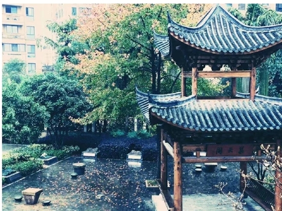 枫树的后面便是那富有古意的集云阁。被雨水打湿的房梁颜色显得愈发浓了,交错的木条拼成的阁顶,让整个阁楼显得挺拔、优雅。在集云阁的外面,摆放着古色古香的石桌石凳,坐在石凳上喝茶看书,就如同古时候的文人墨客般清雅。地上的青砖长出了青青的苔癣,散发出微微的清香,闭上眼睛,就能闻到大自然的气息。静静地听,似乎能感受到大自然平和自己的心跳声。这如诗如画的场景,换了谁,都会觉得心旷神怡。