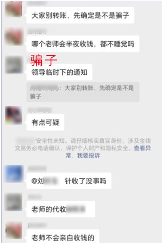 “哪个老师会半夜收钱,都不睡觉吗?”一位警觉的家长发现这个反常情况,立即提醒其他家长不要转账。