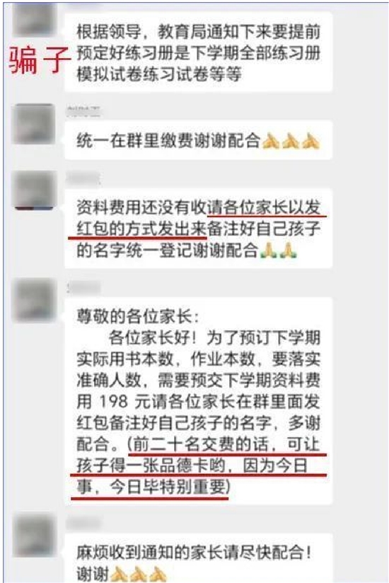 当晚23时许,班主任“刘老师”在家长群突然发出一条缴费信息,让家长们预交下学期资料费198元,并要求以发红包形式缴费。