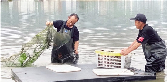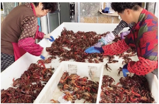 在曹村镇上都村龙虾养殖基地,工作人员划着泡沫筏在池塘里忙碌着,打捞小龙虾。随着一张张网具被收上来,一只只个头硕大的小龙虾被工作人员打捞上岸,随后经过分拣装篮,供商家挑选。乐清客商林先生说:“这里水质好,小龙虾肉质美味,我每天过来拉货,一天要拉个1300斤左右。”浙江荣海锋农业科技有限公司董事长戴晓荣表示,现在一亩的产量是120公斤至125公斤,目前市场平均价格约每公斤56元,一亩地收入是七千元左右。