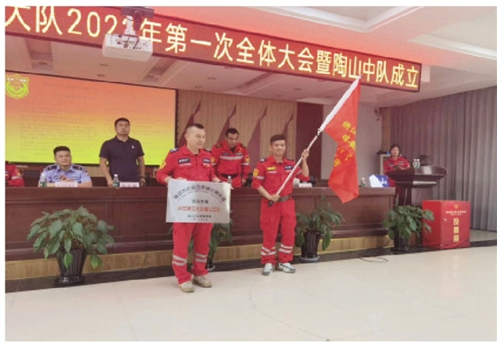 会上,民安救援队瑞安市各中队的130多名队员共同见证了这一历史时刻,民安救援陶山中队队长金崇平从林小锚手中接过委任书并作表态发言。