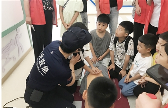 在技能实践区,急救演示老师现场为孩子们讲解了心肺复苏等实用技能,孩子们认真听讲,轮流实操,初步掌握了生活中必要的急救知识。