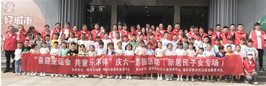 本报讯(记者 陈成成 通讯员 王珏心 黄春连)享受快乐,体验成长。为了迎接即将到来的杭州亚运会,同时欢庆“六一”国际儿童节,6月3日上午,市新居民服务中心联合市妇联在市妇女儿童服务中心举办了以“喜迎亚运会 共童乐不停”为主题的新居民子女“六一”游园会,来自莘塍第七小学的50多名新居民子女与家长度过了快乐又难忘的一天。