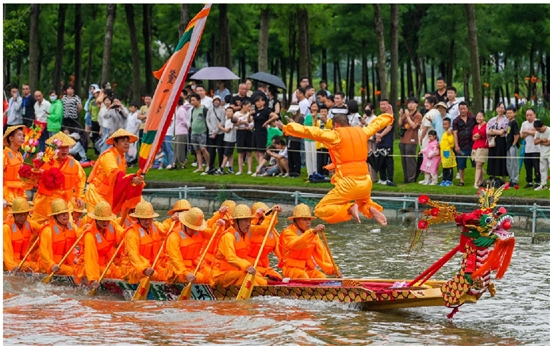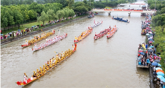 6月22日上午,中塘河莘塍段5公里的水域里,三十多艘龙舟在上千名观众的欢呼呐喊声中,同舟共济、奋勇争先,一展传统民俗文化之魅力。随着龙舟鼓的响起,划手们齐齐挥桨划船,劈波斩浪。这些龙舟代表了各村文化,因此龙舟各有特色、旗帜鲜明,青龙、黄龙、白龙在河道中争相竞逐,场面十分热闹。河里龙舟竞渡,两岸呐喊声、喝彩声交织成一片,市民们和游客们纷纷为龙舟队伍加油助威,互道祝福:“端午安康!”