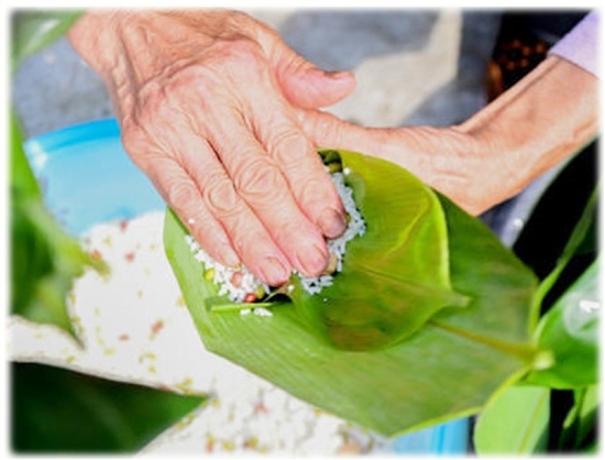 父母早在路边等候,父亲殷勤地指挥着车的停放位置。母亲告诉我,她早上已经做了七八十个粽子了,有本地猪肉粽、红枣粽、蚕豆粽(就是豌豆,本地叫蚕豆)等。我进去一看,果然,那些糯米都是用灰汤(稻草灰沥下的汤)浸泡过的,草黄色,一粒粒圆滚饱满,闪着光,旁边盆里还浸着许多箬叶。母亲手脚麻利地取两张箬叶,一卷,一兜,用勺子舀取糯米倒入,再放入一颗红枣压平,箬叶一盖,用细绳一捆,又一个粽子挂在竹竿上晃了。我笑着说,不用包这么多,吃不了的。母亲说,还有你弟弟嘞,放心,放冰箱冷库里,有好长时间保存的,坏不掉。