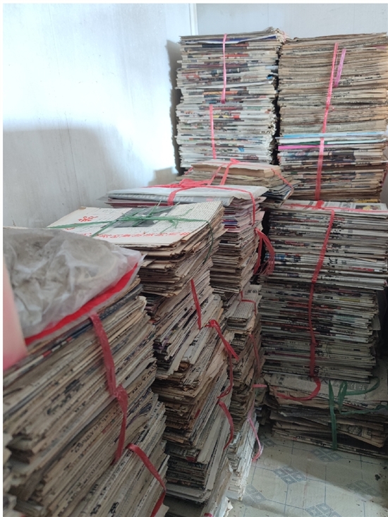 床头的小桌子上整齐摆放着近期的《瑞安日报》,床尾的角落码着一摞一摞报纸,用绳子捆着,一月一小捆、一年一大捆,足有一米高。走上二楼,更多报纸宝贝似地装在纸箱里,一个个“方块”堆满了地板,让人无处下脚。随机打开一箱,保存完好又整齐的《瑞安报》映入眼帘:1994年5月2日,2000年8月2日……一份份被珍惜收藏的旧报纸,无言讲述屋主对《瑞安日报》的深厚情谊。
