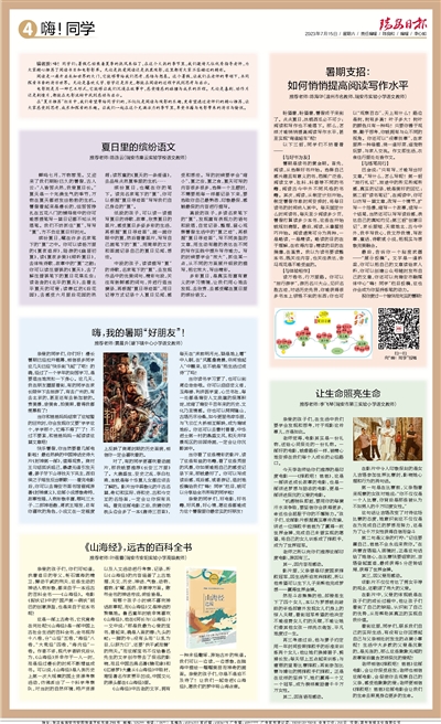 高段的孩子,多读名家笔下的“夏”,发现富有表现力的语句和段落,自觉记录、整理,留心观察暑假生活中的“夏之迹”,再根据“夏日寻迹图”,写不同类型的文章,用生动有趣的表达在不同的写作实践中提升写作能力。写的时候要学会“放大”,抓住某一点,从不同的方面展开细致的描写,把它放大,写出精彩。