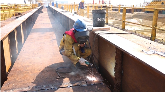 “七八月的工地非常热,我们每天工作9个小时,要出很多汗,一天下来要喝两三斤水。”唐明金是一名电焊工,烈日下的他“全副武装”,包裹得严严实实。他左手拿着面罩、右手拿着电焊机,正在进行钢导梁焊缝拼接作业。由于钢导梁具有较高的吸热性,此时南岸拼装平台上的体感温度已经超过40℃。加之电焊机作业时四溅的火星,热上加热,唐明金身上的工作服早已湿透。