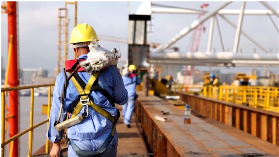 现场,工人牛乘峰和工友各自背着十几公斤重的拼接工件,拾级而上。他告诉记者,每次将工件搬运到南岸拼装相当于爬十层楼梯,而他一天至少要上下五六趟。“快下班的时候是最累的,因为这个时间点体力已经消耗得差不多了。”他说。