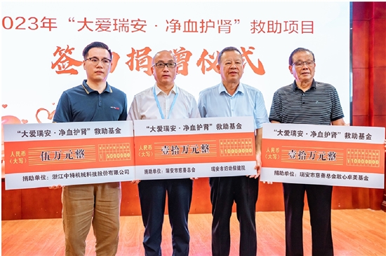 为尿毒症患者送去延续生命的希望,帮助更多陷入困境的家庭,2016年3月,“大爱瑞安·净血护肾”慈善项目启动,设立“肾透析救助基金”。这是我市首个针对困难尿毒症患者的救助项目,解决他们无钱治疗、因病致贫的难题。期间,不断有爱心企业加入其中奉献爱心。