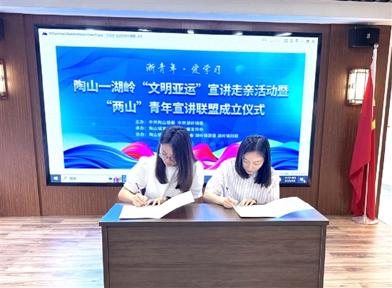 在湖岭镇永乐村移风易俗馆,简单举行了陶山-湖岭“两山”青年宣讲联盟成立仪式,陶山镇宣传委员陈雅洁、湖岭镇宣传委员孙海琼代表两地签订协议书。该联盟共吸引80名青年加入,涵盖两地镇机关干部、基层站所工作人员、教师等。