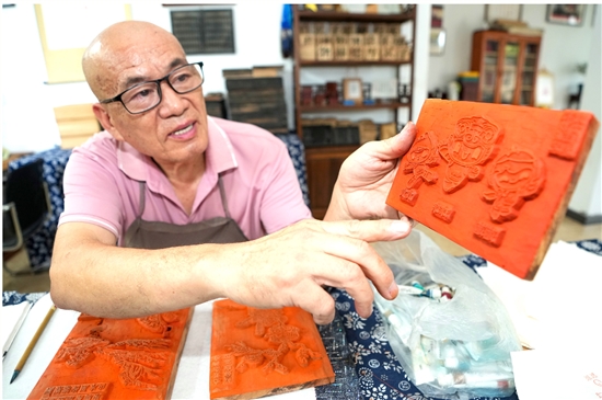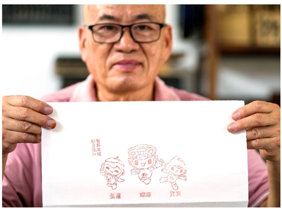在王钏巧木活字工作室,只见他在一块A4大小的印版上刷了红色颜料,均匀而快速地涂抹印版,掀起覆盖在上面的宣纸后,亚运会吉祥物宸宸、琮琮、莲莲跃然纸上,憨态可掬。