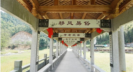 移风易俗馆的前方,是该村的“孝园”,里面种有一棵“孝树”,树上挂着村里孩子对长辈当面说不出的“成长的烦恼”和“爱的语录”。后面,则是一条长长的“孝长廊”,廊顶是各类文明宣传标语,廊壁上则挂有该村村规民约、文明家庭事迹等,村民来此休憩、散步就可以看到邻里之间的文明故事,感受文明之风。