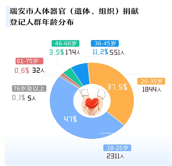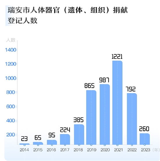 思想上的改变直接体现在登记捐献志愿者数量上。近年来,瑞安市登记人体器官(遗体、组织)捐献人数总体呈上涨趋势,2021年更是达到了1221例。“2019年,登记捐献采用了更为便捷的线上方式,登记人数大幅增加。”金玉如说。