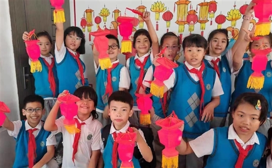 吃过午饭,我们开始学习制作无骨花灯。根据老师耐心讲解的方法,我们先把画好的图案剪下来,折叠成平行,再压平。然后,在老师的帮助下,拿出针,在平整的那一面刻上图案。这非常需要想象力,有些人刻名字,有些人刻兔子,还有些人刻数字……到糊裱的时候,我总是对不齐边框,经过好几次折叠、涂胶才完成这一步。最后,我们把花灯撑开,粘上流苏,装上提灯,无骨花灯制作好啦!看着自己做的无骨花灯,我想起了老师讲述的传说:相传南宋时期有一位叫曹叔远的人,他考上进士回乡探亲,乡亲们为了庆祝,在金锁桥上挂了一个花灯,挂灯的时候是正月十五,于是,曹村元宵闹花灯的习俗就一代代流传下来,至今已有800多年的历史。