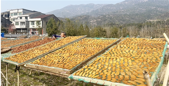 在陶山镇固前村的田头路边,一排排用竹木搭制的排架上,铺满了村民们精心制作的“红薯枣”。这些“红薯枣”大小厚薄均匀,色泽金黄鲜艳,成为该村一道靓丽的风景线。