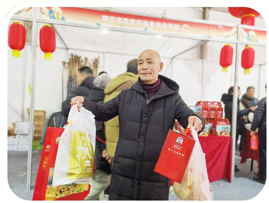 春节前逛展会买年货是不少瑞安市民的习惯,暂停了四年,不少人纷纷表示“好怀念”。这不,农展会开幕才一个多小时,市民蔡炳瑞的双手已经拎着大袋小袋的“战利品”:有索面、粉干,还有水产干货。说起阔别四年的农展会,他感慨满满:“这种大规模的农展会很好,挑选年货很方便,以前我每年都会逛,买点农产品过新年,前几年受疫情影响没有举办挺可惜,这次重启必须来!”