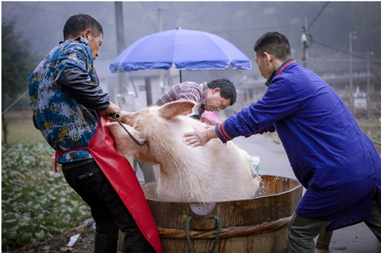 翌日清晨,两铁制的土灶台,我把柴爿烧得极旺,两大镬沸水腾,杀猪老司至。他放下竹篮,哈着热气,凑近灶台口,双手烤个火,与我寒暄几句。竹篮里,木制刀闩里插着五把短刀,松木制的木柄上油光锃亮,两把砍刀,一个杀猪钩子,两块旧纱布。待岳父把猪赶出圈舍,老司顺势往猪下巴猛地一记铁钩,一拽,众男壮劳力,齐心上阵,揪耳朵,挈猪尾巴,连拉带拽,拖至杀猪凳旁,掰猪前腿用力一翻,在绝对的实力和经验面前,我们把它摁在了凳上,再用尼龙绳五花大绑。此时此刻,“二师兄”撕心裂肺,凄厉嚎叫,响彻山谷。老司让我负责帮他拉着铁钩,好让他腾出手来用纱布捆了猪的嘴巴。待岳母端来加了水放了盐巴的木盆,老司用尖刀往猪颈动脉猛地一捅,白刀子进红刀子出,猪血瞬间倾注而出,不一会儿就盛了满盆。他再用刀柄麻溜地搅拌了几下猪血,吩咐岳母立马端走盆子。
