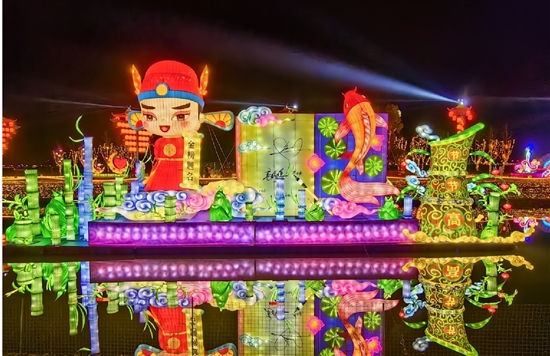 走在天井垟的旷野中,只见初春的田园综合体美丽如画,天井垟河(又名“曹村港”)依偎在一旁静静流淌,波光桥影,随风摇曳,月影灯光,浑然一体……田园边、河岸上到处都是色彩绚丽的灯组,约300亩的空地上摆放了40多个,形态各异、美不胜收。观赏这场花灯盛会,像是听一曲流淌的“江南韵”。