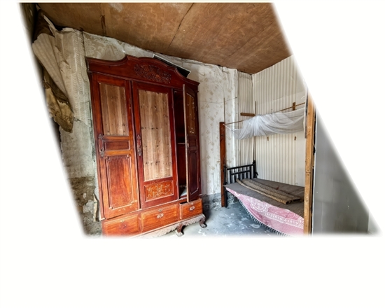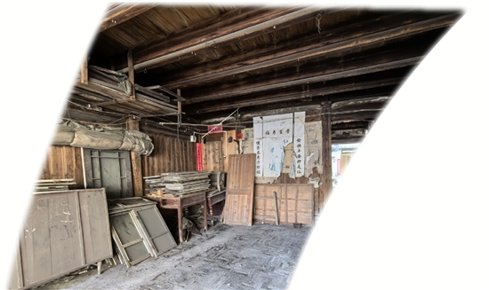 跨入院,迎面而来是一爿大堂屋,两侧各两间厢房,共5间。多处层檐门窗已经断裂腐朽,屋顶瓦片残缺破损,堂屋里地砖留下斑驳的痕迹。曾经气派华丽的宅院,如今变得陈旧不堪,只剩下蜘蛛网在空中摇曳,空气中弥漫着一股陈旧的纸张气息。