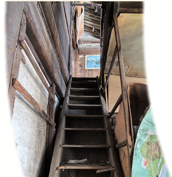 踩着堂屋后的木梯,上了二楼。“咯吱咯吱”作响的木地板,使人担心随时有垮塌的危险。窗台上积满了厚厚的尘埃,木盆等老物件静静躺在角落里,弥漫着阵阵霉味。阳光透过破碎的窗户漏进屋内,斑驳的光影在尘埃中跳跃,仿佛在诉说着往日的故事。