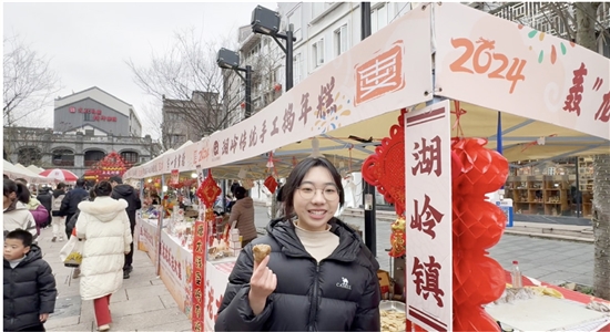 据活动主办方负责人黄雯雯介绍,新春市集上,全市23个乡镇(街道)设展位展示了超百款美食特产、家乡好物,从湖岭传统手工捣年糕、莘塍五香干、陶山甘蔗等地方美味,到东山海产品、马屿红糖姜茶、林川菜籽油等年货、伴手礼,再到仙降胶鞋、曹村花灯等各地特色产品,都成为了返乡大学生的创作素材。