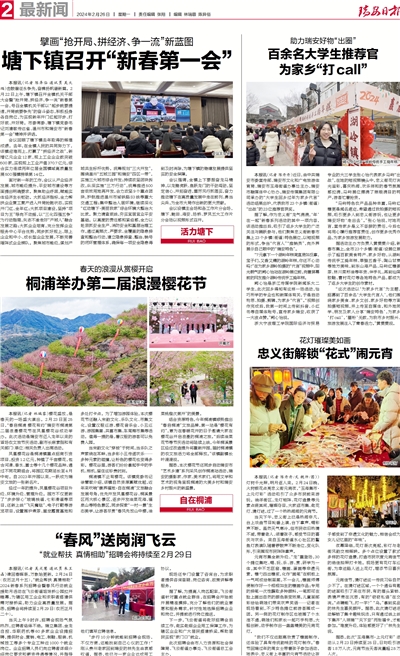 结合资源特色,今年桐浦镇顺势推出“春启桐浦”文旅品牌,第一站是“樱花有约”,意为在春暖花开的日子邀请大家在樱花谷开启浪漫的桐浦之旅。“后续油菜花节等节庆活动将陆续上线,今年桐溪景区经过改造提升将重新开园,届时桐浦镇的农文旅活力将全部释放。”该镇副镇长叶漪漪说。