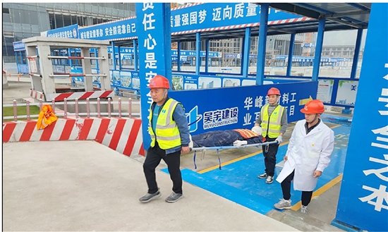演练模拟高温暴雨天气中,应急抢险队伍迅速集结,有序组织施工人员疏散撤离,妥善开展应急抢险处置的情形。“疏散组,通知各班组停工,全部撤离到安全区域,清点人数” “低洼易涝点、地下空间有积水风险,马上进行沙袋封堵”……负责现场指挥的项目负责人针对突发情况迅速给各救援小组下达救援指令,各组人员根据之前学习的应急知识快速疏散、紧急处置。医疗组则准备好担架等抢救器材,及时救助受伤人员。