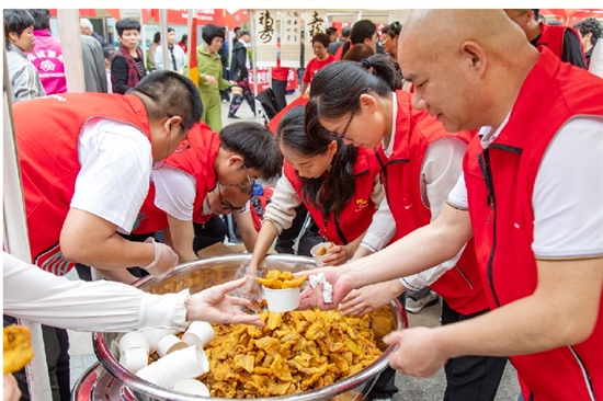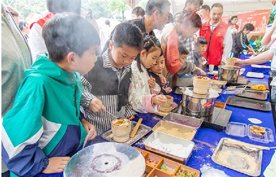 美食区最为热闹。炒粉干、猪油渣、爆米花、棉花糖“一摊集齐”,一波又一波居民在摊位前“解馋”,热度不断攀升。炒粉干摊位的掌勺大厨支起大铁锅,开动猛火,放料、翻炒,一气呵成。“我们手中的美食券就是美食区的‘流通货币’,大家吃得很开心!”现场一居民说。邻里节还突出地方特色,邀请当地民间手艺人带来了米塑、银器等非遗作品展示,吹糖人摊位更是排起了长龙。