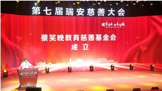 近日,在第七届瑞安慈善大会上,蔡笑晚之子蔡天文专门从美国费城飞回家乡,并携兄弟姐妹共同捐赠200万元,正式成立蔡笑晚教育慈善基金会,以实际行动支持家乡慈善事业和教育发展。