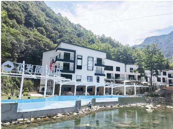 记者来到花岩假日山庄,一探究竟。窗外的涓涓溪水,脚底的石砖墁地,院内的无边泳池,仿佛整个民宿融入在这片绿色森林氧吧中。