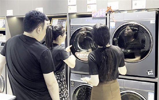 6月14日,在瑞安电星家电城里,陆续有市民进店挑选家电,不少消费者正在咨询洗衣机和烘干机。“家里的衣服要天天换洗,而近期下雨,衣服洗了都晾不干。考虑到这个,还是来买一台洗烘一体机吧。”市民李女士正在选购一台洗衣烘干一体机。