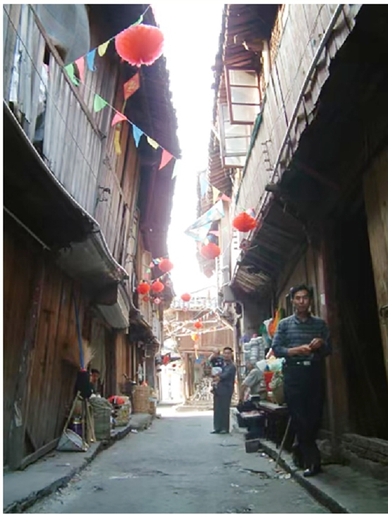 老街沿河临水而建,狭小幽深,街铺屋檐几近相连,有些相距甚而不到一尺距离,屋檐紧挨着屋檐,店铺依傍着店铺,形成了著名的“一线天”街景,恰如乡民们对老街最形象贴切的描绘:“街顶一线天,店堂面对面,青石铺金路,店后依河边。”