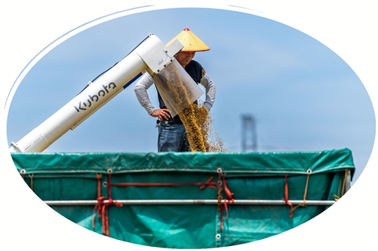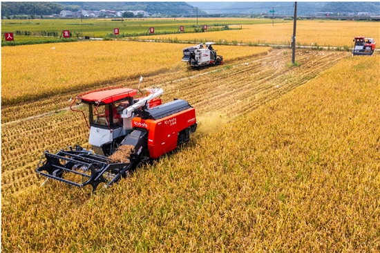在天井垟粮食生产功能区,放眼望去,田间一片金黄,一串串饱满的稻穗压弯了稻秆。7月9日,伴随着机器轰鸣声,瑞安市康园农业专业合作社的3台大型收割机在金色的稻浪中来回穿梭,拉开早稻开镰收割序幕。一茬茬水稻被卷入收割机里,割稻、脱粒、除杂、吐秆一气呵成,金黄的稻谷颗粒归仓。田埂上,大货车载着满满稻谷,将其运送至温州市新丰种子有限公司进行烘干、加工。