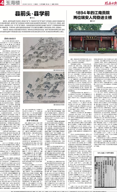 笔者1945年秋到瑞中读书时,也去过县学,那时骑街牌坊早拆了。但听父老们说:瑞安县前街是吴会(苏州)至闽山(福建)的三省沿海平原的交通要津中繁华通道,南来北往的官员、武将、驿卒如果需要紧急赶路的,可以直接骑马、坐轿从泮池背面的小路绕过去。既不负对孔圣人失敬的骂名,又不耽误时间。