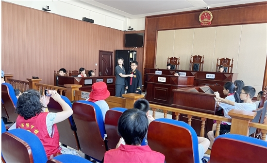 在庄严的审判庭,法官向小营员们介绍审判庭的功能布局,以及法袍、法槌的含义和作用,还用通俗易懂的语言教育孩子们要从小学习法律知识,明辨是非与善恶,树立正确的价值观。随后,现场举办模拟法庭,邀请小营员们分别坐在法官、书记员、公诉人、辩护人席位,扮演庭审角色。他们敲响法槌,体验法官审判活动的流程,亲身感受审判工作的庄重和威严。