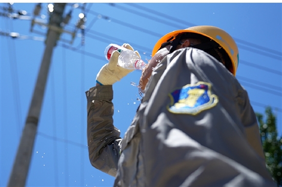 7月以来,我市持续出现晴热高温天气,用电负荷随之攀升。日前,身着绝缘防护服的温州华电实业有限公司的带电作业人员无惧烈日炙烤,在湖岭镇开展引线搭火作业,确保电力设施稳定运行。当时室外温度就已攀升到38摄氏度,户外地面温度超过50摄氏度。