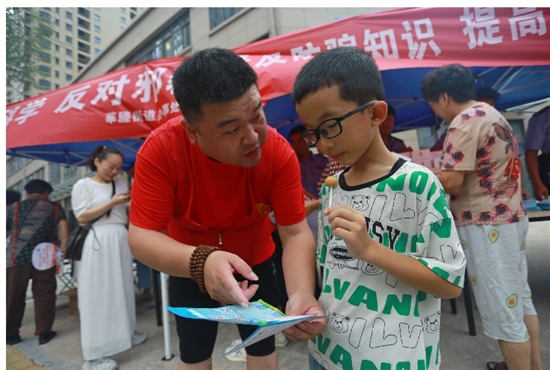 走进集市,一个个内容丰富的宣传摊位映入眼帘,涵盖平安建设、禁毒、反邪教、反诈、普法等多个主题。