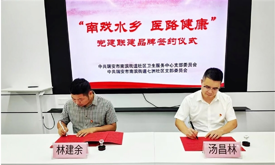 本报讯(记者 严小章 通讯员 蔡文文)9月10日下午,南滨街道社区卫生服务中心党支部、七洲社区党支部共同签订了《“南戏水乡 医路健康”党建联建协议书》,将为七洲社区居民提供更多更好更优质的医疗健康服务。