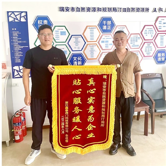 本报讯(通讯员 蔡跃亨 张适意 记者 项依晴)“多亏了你们积极对接,帮我们解决了头等大事!”近日,汀田资规所收到一面来自浙江鑫泰阀门科技有限公司送来的锦旗。该企业负责人表示,汀田资规所“管家”工作服务模式,帮助企业顺利开工。