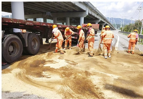 面对这一紧急状况,市交通运输局陶山站队迅速响应,调集了一支由10名专业养护人员组成的应急队伍,配备1辆高效应急车辆及所需物料,火速赶往事故现场。抵达现场后,他们立即展开有序而高效的救援行动,在污染路段摆放好安全锥,提醒过往车辆减速慢行,同时安排人员在该路段撒上锯木灰,将油污吸附干净后再对路面进行清理。