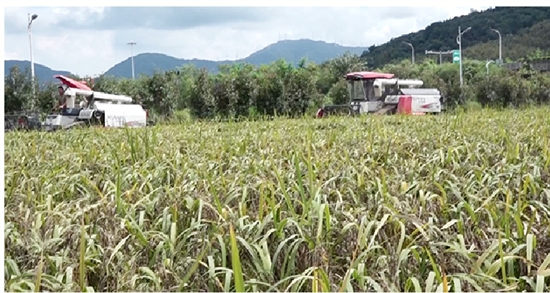本报讯(记者 陈峥 特约记者 方孔德)10月8日,马屿镇源田家庭农场的紫米稻田里,稻浪随风起伏,饱满的稻穗低垂,收割机的轰鸣声回荡在田野间,奏响了秋天的丰收乐章。