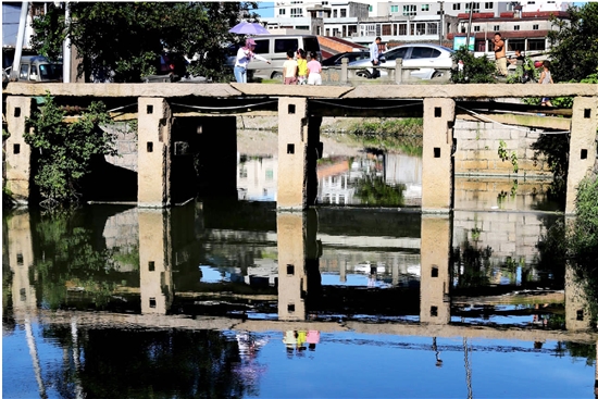 石岗陡门由水闸与桥组成,俗称“闸桥”,四孔。最抢眼的是闸门石柱,方形,有放闸板的凹槽,当为陡门最重要构件。泄水时闸板开启,蓄水时闸板放下,这就是陡门的工作过程。桥是行人的桥,桥面铺条石5根,听说为便船只通行,中间两孔被抬高,成为稍带有拱势的桥面。石岗——下林,下林——石岗,桥把两岸连起来。