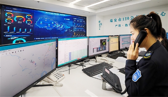 为了赋能“院前”,瑞安市急救120中心更新救护车随车硬件设备标准化清单,增配可视喉镜27台,具备5G通信传输功能的除颤监护仪39台,并通过5G数字赋能,搭建院前急救系统与二级以上医疗机构信息共享平台,实现病人基础信息、车载视频、生命体征数据、车辆位置等信息一屏集成,便于院内医生提早介入,及时做出病情判断并进行远程指导,提前制定抢救方案,做到“上车即入院”。